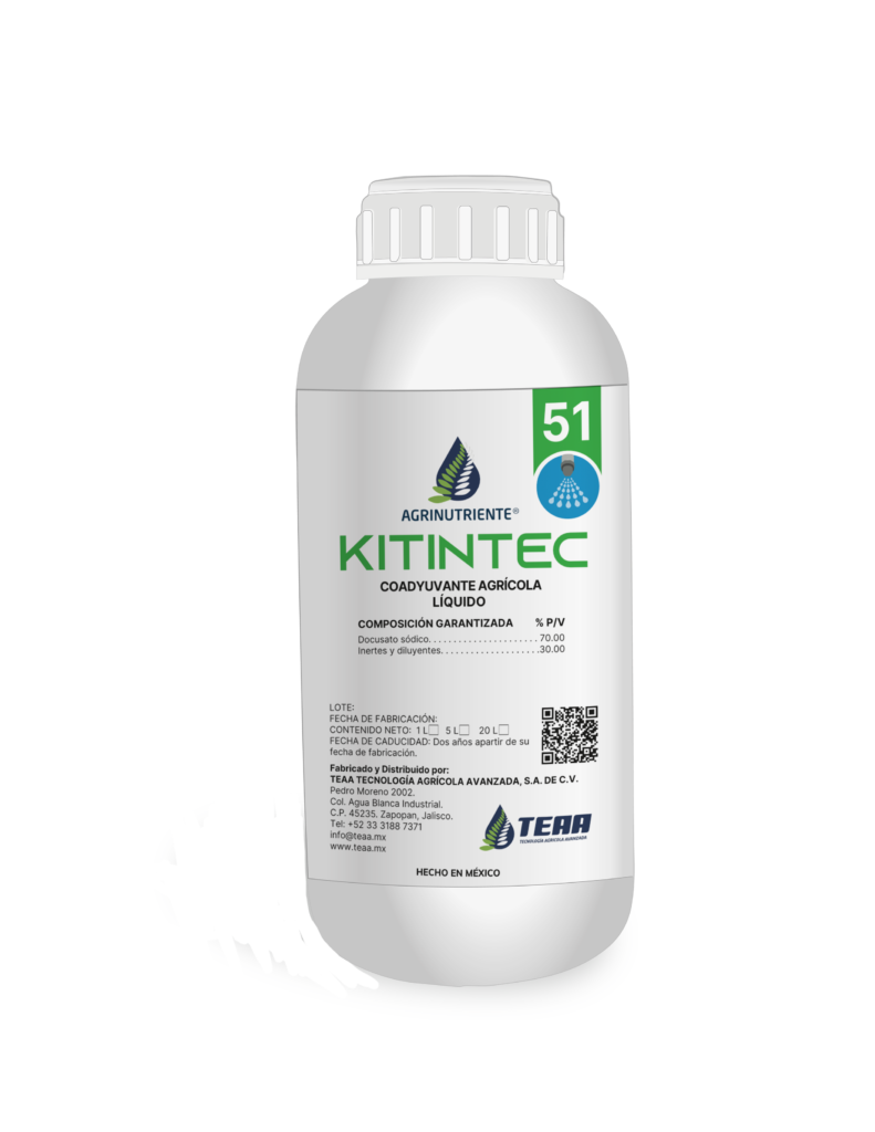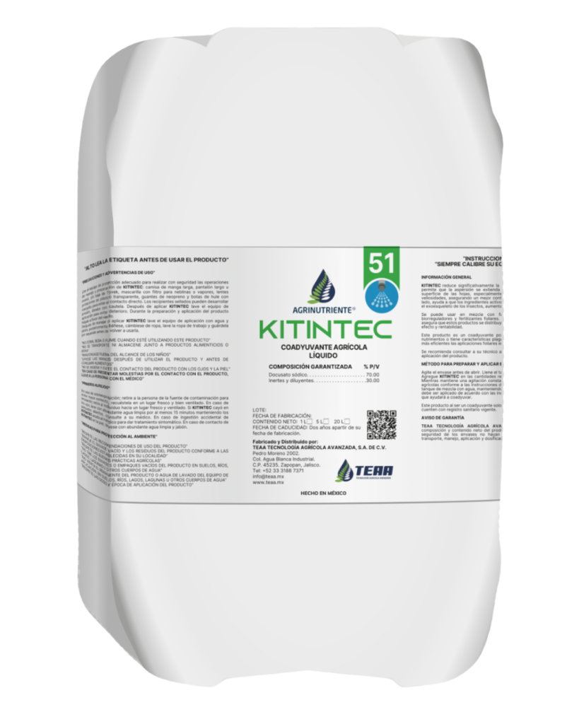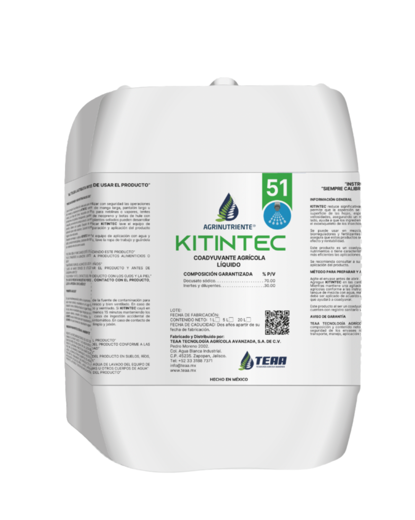 KITINTEC® es un coadyuvante agrícola con capacidad dispersante, humectante y penetrante, que eficientiza las aplicaciones foliares de insecticidas y acaricidas.